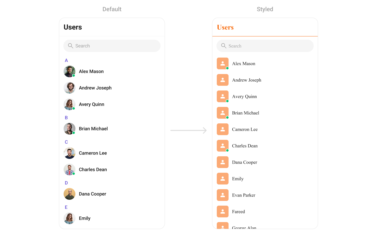 TheCometChatUsers Component displays a scrollable list of users. It is ideal for showcasing available contacts for messaging, calls, or group creation. Developers can style elements like user avatars, status indicators, and list backgrounds to align with their design guidelines.