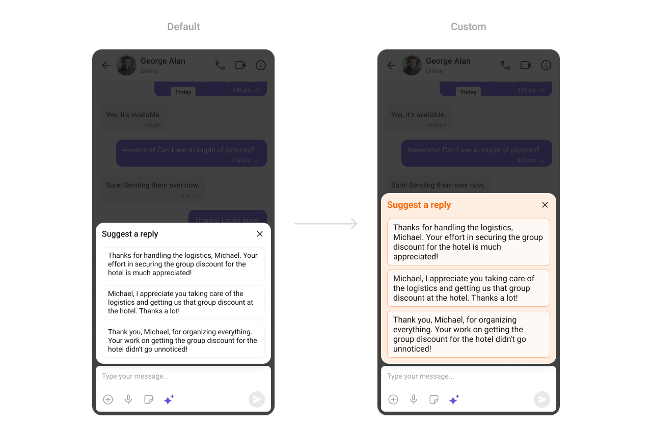 TheCometChatConversationStarter Component offers AI-based suggestions or reply options to initiate a chat. Developers can customize the background, text styles, and button appearances to ensure seamless integration with the app’s visual language.